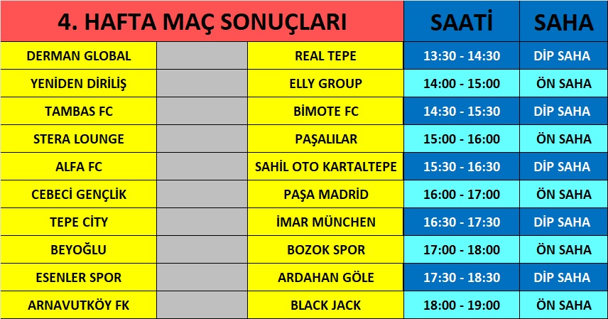 42. EBU MEDYA FUTBOL TURNUVASI 4. HAFTA MAÇ SAATLERİ YAYINDA.. ![]() 42. EBU MEDYA FUTBOL TURNUVASI 4. HAFTA MAÇ SAATLERİ YAYINDA.. 4. Haftaya girerken puan durumlarının her hafta değiştiği ender turnuvalardan birini yaşıyoruz. Şampiyonluk hayalı kurup turnuvaya katılan bir çok takım ilk 3 hafta geride kaldığında '' hedeflenen şampiyonluğun hiç kolay olmayacağı '' durumuyla karşı karşıya kalmış durumda. Neredeyse tüm maçların zorluk seviyesi yüksek. Bir çok takım sorumlusu şimdiden hangi maçtan kaç puan alabilirim diye ABAKUS hesabi yapmaya başladı. İşin ilginç tarafı çok iyi mücadele veren takımların kaybettiklerine de şahit olurken, bu hafta direklerden dönen toplar şans faktörünü de ortaya çıkarttı. Tüm takımlara basarılar dılerız. İŞTE MAÇ SAATLERİ..
