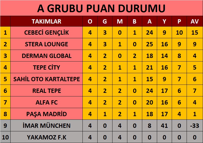Turnuvamızın yeni takımı YAKAMOZ F.K turnuvamıza dahil oldu. YAKAMOZ F.K takımı nasıl bir kadro ile turnuvamıza girecek az çok belli. Genç bir arkadaşlık ortamını turnuvada zevkine bir oyunla pekiştirmek istiyorlar. Daha önce EDİRNEKAPI daki turnuvamızda yer almışlardı ama malesef çok istedikleri gibi olmadı herşey. Uzun zamandır ayrı kalmışlarda bu turnuvada bizlerle olmak istediler. Kaptan EMİRHAN KOÇ önderliğinde genç ve birlikte oynamış oyunculardan kurulu bir kadro olduklarını biliyoruz. Kendilerine başarılar diliyoruz. Kurallarımız gereği YAKAMOZ F.K takımı sıfır puan ve sıfır averaj ile turnuvamıza bu pazar günü başlayacaktır. Turnuva sonunda geçmişteki dört maçtan sadece ikili ve üçlü averajlarda sorumlu tutulacaktır. (4 maçın skorundan sanki kendisi oynamış gibi sorumludur) Bu kurallarımız yedek takımlar turnuvamıza alınmadan onlar ile görüşülüyor ve puan durumu, gelecek maçlar ile bilgiler aktarılıyor. Uzun süredir bu kurallarımızla yedek takımları turnuvamıza dahil ediyoruz. Tüm takımlara başarılar dileriz. İşte Son Puan Durumu :