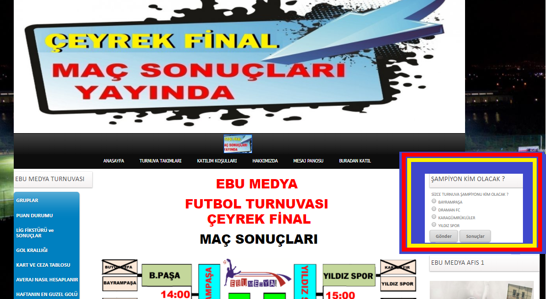 Turnuvamızda artık nefesler tutuldu. 32 takım arasından son 4 takım yoluna yarı finalde devam edıyor. Son 8 takıma C GRUBUNDAN tam 8 takım kalırken, yarı finale ise B grubundan BAYRAMPAŞA ve YILDIZ SPOR, C grubundan ise KARAGUMRUKLULER ve DRAMAN FC takımları kalmayı basardı. Şimdi ise siz takipcilerimizin tahmınlerınde sıra. ŞAMPİYON KİM OLUR ANKETINE KATILMAYI İHMAL ETMEYIN. |