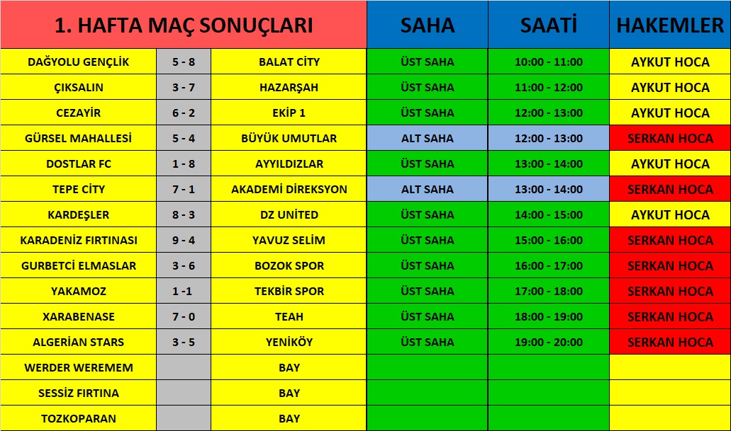 Turnuvamızın ilk haftasında takımlar tüm güçlerini ve hünerlerini sahaya yansıtmaya çalışırken, bazı takımların ilk hafta sendromu yaşadığı ve eksik kadrolarla mücadele etmesi gözlerden kaçmadı. Yapılan 12 macın sadece bir tanesi berabere sonuçlandı. En fazla 7 farkın olduğu maçlarda genelde seyir zevki yüksek maçlar izledik. İşte maç sonuçları ve skorlar. |