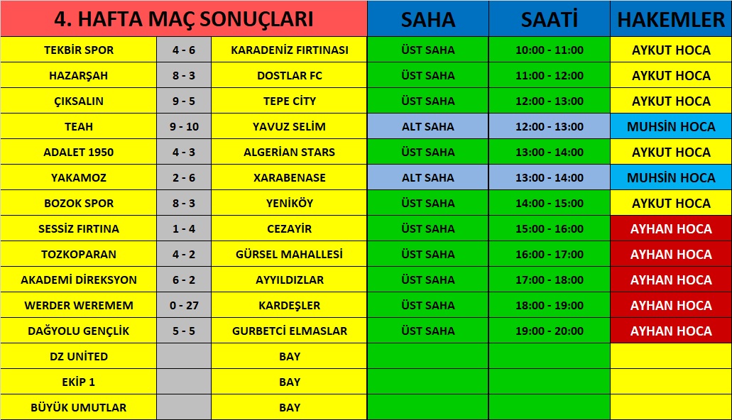 EBU MEDYA / IRMAKLAR AİLESİ FUTBOL TURNUVASI 4. HAFTA MAÇ SONUÇLARI YAYINDA ![]() EBU MEDYA / IRMAKLAR AİLESİ FUTBOL TURNUVASI Bu hafta turnuvamızda son zamanlardaki en farklı galibiyeti görürken ayrıca maç skorlarında süpriz sonuclara da şahit olduk. Ayrıca maçın 4-1 devam ederken SESSİZ FIRTINA nın sahadan çekilmesi de sahalarımızda ender gördüğümüz bir durumdu. Maç hükmen 4-0 olarak tescil edildi. Sıcak havaların kendini hissettirdiği son zamanlarında bir çok takım ve oyuncunun bu sıcaklardan etkilendiğini gördük. Bazı takımların tam kadro gelemeyip maçlara eksik çıktığıda görüldü.