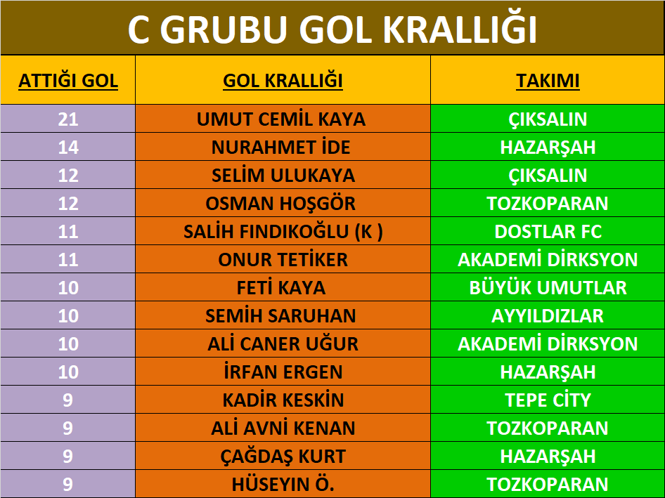 EBU MEDYA / IRMAKLAR AİLESİ FUTBOL TURNUVASI C GRUBU GOL KRALI BELLİ OLDU....... ![]() EBU MEDYA / IRMAKLAR AİLESİ FUTBOL TURNUVASI Onu ilk kez görenlerin hemen dikkatin çekmesi bir yana, hemen bir lakap takılan ender oyunculardan. Kimine göre NWAKAEME, kimine göre GHEZZAL, kimine göre ise MESSİ. C grubunun gol kralı 21 golle ÇIKSALIN takımının önemli ayağı UMUT CEMİL ÇALIŞKAN oldu. Hız, adam eksiltme, sert şut ve ince öldürücü paslar, işte tüm bu zellikleri bize izleten UMUT CEMİL ÇALIŞKAN ı tebrik ediyor ve elemelerde basarılar dılıyoruz.