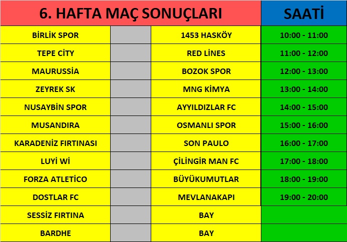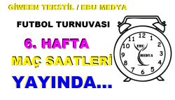 GİWEEN TEKSTİL / EBU MEDYA FUTBOL TURNUVASI 6. HAFTA MAÇ SAATLERİ YAYINDA.. ![]() GİWEEN TEKSTİL / EBU MEDYA FUTBOL TURNUVASI 6. HAFTA MAÇ SAATLERİ YAYINDA.. Turnuvamızın 6. hafta maç saatleri yayınlandı. İŞTE MAÇ SAATLERİ.. ![]() |