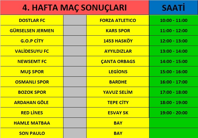 Turnuvamızın 4. hafta maç saatleri yayınlandı.