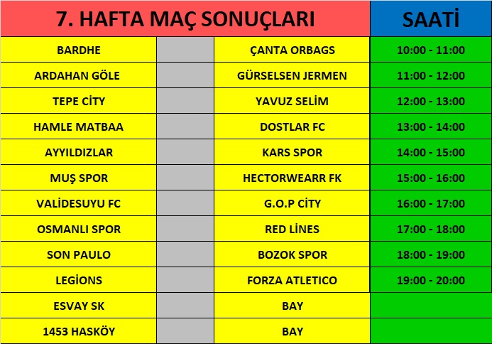 VAHAP YILDIZ SİGORTA / EBU MEDYA FUTBOL TURNUVASI 7. HAFTA MAÇ SAATLERİ YAYINDA.. ![]() VAHAP YILDIZ SİGORTA / EBU MEDYA FUTBOL TURNUVASI 7. HAFTA MAÇ SAATLERİ YAYINDA.. Turnuvamızın 7. hafta maç saatleri yayınlandı. İŞTE MAÇ SAATLERİ..