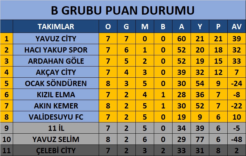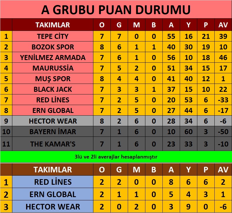 2 TAKIM DAHA TURNUVADAN ÇEKİLME KARARI ALDI.... ![]() 2 TAKIM DAHA TURNUVADAN ÇEKİLME KARARI ALDI.... Turnuvamızın 8. haftası geride kaldı ve bu zaman zarfında A GRUBUNDA istedikleri oyunu ve sonuçları elde edemeyen, sonrasında kadro kurmakta zorlanan iki takım turnuvadan çekilme kararı almıştır. BAYERN İMAR takımı grubun hafif takımlarından olarak dikkat cekmıştı. Turnuvadan çekilme kararı aldı. Bir çok kişinin bize '' diğer takımlar fark attığı takıma biz 3-0 hukmen mı sayılacagız '' ya da '' diğer takımların gol krallıgı için cok gol attıgı takıma biz hukmen yazılınca gol yazılmayacak mı '' soruları geçmişte olduğu gibi fazlaca gelecektir. Fakat cevaplar malesef EVET. THE KAMAR'S takımı turnuvamıza büyük ümitlerla katılmıştı. Hatta en başından beri 3 farklı isim ile anılmıştı ve sponsor desteği ile THE KAMARS olarak turnuvamıza katıldılar. Takımda amator oyuncuların cogunlugu ile mac gunu kadro kurulamaması bu takımın sonunu getirdi diyebiliriz. Ayrıca dün B grubunda ÇELEBİ CİTY takımın men edilmesiyle en son puan durumları asagıdakı gıbıdır.