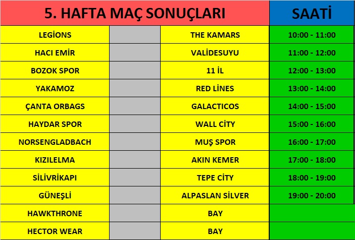 ÖZELLER SUNİ DERİ / EBU MEDYA FUTBOL TURNUVASI 5. HAFTA MAÇ SAATLERİ YAYINDA.. ![]() ÖZELLER SUNİ DERİ / EBU MEDYA FUTBOL TURNUVASI 5. HAFTA MAÇ SAATLERİ YAYINDA.. Turnuvamızın4. hafta maçları geride kaldı. Dün oynanan bir çok maçta ilk yarısını galip tamamlayan takımların maç sonunda mağlup olduklarını gördük. tam 6 mac u sekılde tamamlandı. Maçı bırakmayıp sonuna kadar mücadele eden takımlara şahit olduk. Ayrıca bir çok takımın yenilgilerini hakemi bağlamaları, bazı takımların hakemlerin çok basit faul ve kart verdiğini, bazı takımların ise hakemlerin faul ve kart kullanamadığını bahane etmelerine hayretler içinde şahit olduk. :) Maçı kazanan takımların genelde HEKEMLER ile uğraşmayan takımların olması ise sanıyoruz bir tesadüf değil. Tüm maçların yorumları bu aksam YOU TUBE kanalımızda yayında olacak. İŞTE 5. HAFTA MAÇ SAATLERİ..