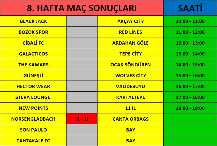 STERA LOUNGE CAFE / EBU MEDYA FUTBOL TURNUVASI İŞTE 8. HAFTA MAÇ SAATLERİ YAYINDA.. ![]() STERA LOUNGE CAFE / EBU MEDYA FUTBOL TURNUVASI İŞTE 8. HAFTA MAÇ SAATLERİ YAYINDA.. Bu pazar günü yani 9 Haziran da oynanacak 8. hafta maçları sonrasında turnuvamıza KURBAN BAYRAMI arası verilecek ve 16 Haziran pazar günü tatil olacaktır. 23 Haziran Pazar günü ise 9. hafta maçları oynanacaktır. Eleme turlarına geçmeye sadece 4 hafta kaldı. Artık gruplar şekillendi ve hangi takımların, hangi torbadan kura çekimine gireceğin merakla bekliyoruz. İŞTE 8. HAFTA MAÇ SAATLERİ YAYINDA..