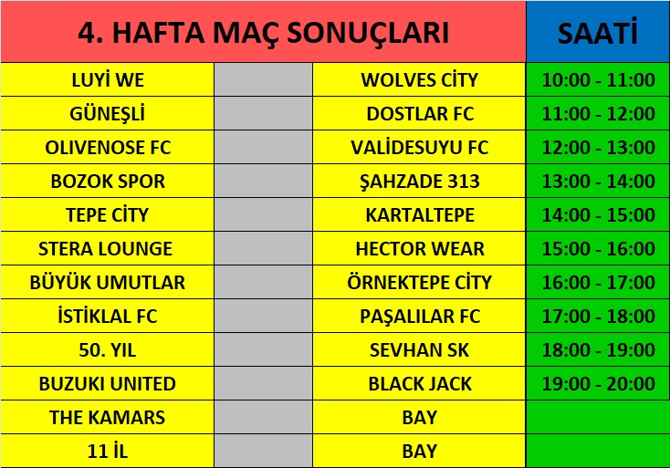 38. EBU MEDYA / STERA LOUNGE CAFE FUTBOL TURNUVASI 4. HAFTA MAÇ SAATLERİ YAYINDA.. İŞTE MAÇ SAATLERİ.. ![]() STERA LOUNGE CAFE SPONSORLUGUNDA 4. HAFTA MAÇ SAATLERİ YAYINDA. 3. haftayı geride bıraktık ve puan tabloları az çok belli olmaya başladı. bir çok süpriz sonuçlar ilk 3 haftaya damga vurdu. Lig maçlarından çok eleme maçlarına konsatre olan takımlar görüyoruz. Yeni takımların ilk 3 hafta karnesi için bu hafta bir video cekimimiz olacak. Grup değerlendirmeleri için bu akşam saat 19:00 da canlı yayında YOU TUBE kanalımızdayız. Ayrıca bu hafta yine bi gol krallığı için özel video çekimimiz olacak. 38. EBU MEDYA / STERA LOUNGE CAFE FUTBOL TURNUVASI 4. HAFTA MAÇ SAATLERİ YAYINDA.. İŞTE MAÇ SAATLERİ..