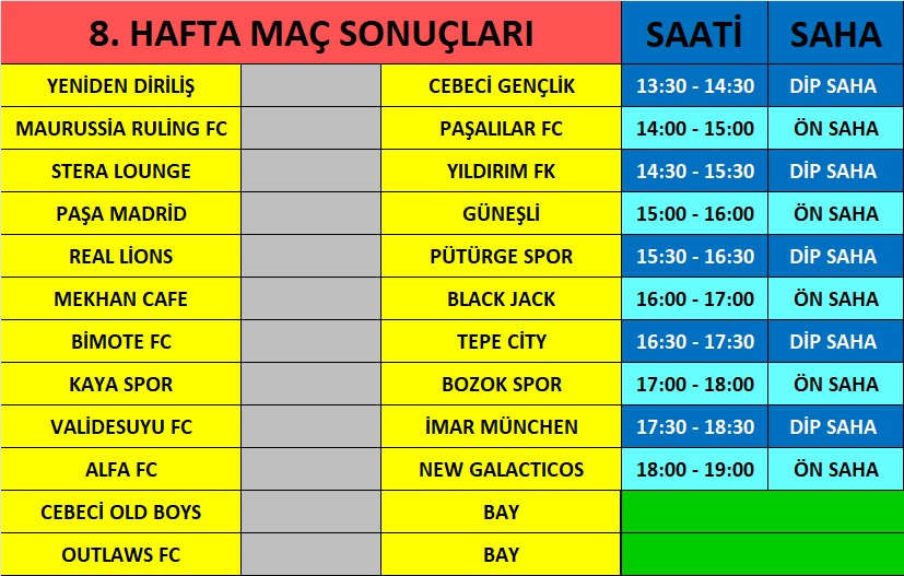 RENESMEE / EBU MEDYA FUTBOL TURNUVASI 8. HAFTA MAÇ SAATLERİ YAYINDA. ![]() RENESMEE / EBU MEDYA FUTBOL TURNUVASI 8. HAFTA MAÇ SAATLERİ YAYINDA. Öncelikle havaların erken kararması ve yaz mevsimini geride bıraktığımız bu günlerde artık saha içerisine güneş ışıklarının da az girmesinden dolayı maç fotoğrafları istediğimiz gibi netlikte olmuyor. Bir çok fotografı silmek zorunda kalıyoruz. Üstü kapalı sahalarda bunu çok yaşıyoruz. Yayınladıgımız fotograflardan da cok mutlu degılız. İlerleyen haftalarda da bu şekilde olacak malesef :( Turnuvamızın son lig maçları yaklaştı. 8. hafta maçları için tüm takımlara başarılar dileriz. İŞTE MAÇ SAATLERİ..