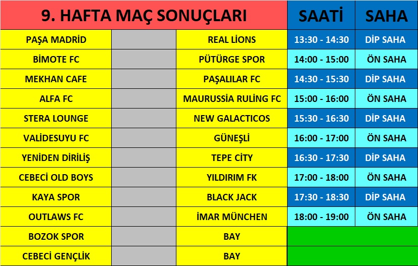 RENESMEE / EBU MEDYA FUTBOL TURNUVASI 9. HAFTA MAÇ SAATLERİ YAYINDA. ![]() RENESMEE / EBU MEDYA FUTBOL TURNUVASI 9. HAFTA MAÇ SAATLERİ YAYINDA. Son 3 haftaya girilirken puan hesaplamaları ve hedefler iyiden iyiye belirginleşmeye başlandı. Bu hafta canlı yayında hangi takımın hangi maçları kaldı ve hangi takımların şansı daha fazla durumlarını değerlendireceğiz. 9. hafta maçları için tüm takımlara başarılar dileriz. İŞTE MAÇ SAATLERİ..