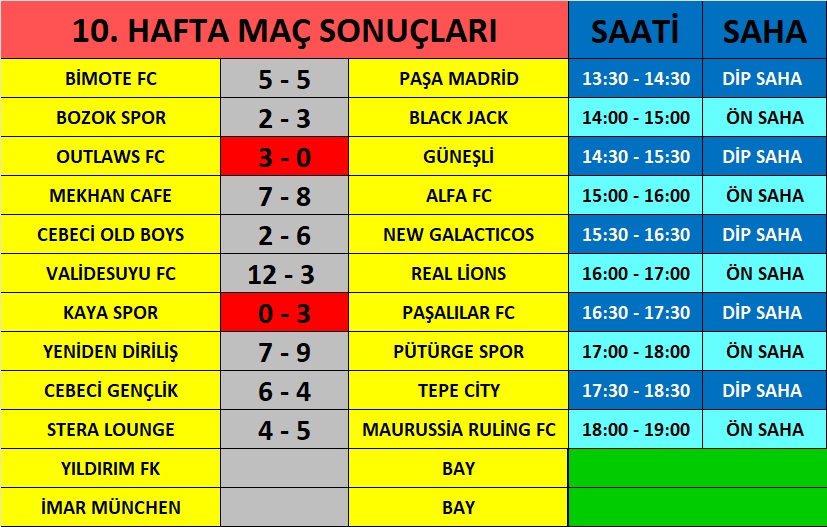 RENESMEE / EBU MEDYA FUTBOL TURNUVASI 10. HAFTA MAÇ SAATLERİ YAYINDA. ![]() RENESMEE / EBU MEDYA FUTBOL TURNUVASI 10. HAFTA MAÇ SAATLERİ YAYINDA. Bir hatırlatmayla başlayalım. Turnuvamızda SON HAFTA MAÇLARI HARİÇ maça gelmeyen takımlar iki takımında saha ücretini ödemek zorundalar. Son hafta ise bir çok takımın puan tablosunda yerleri netleştiği ya da en önemlisi gruptan çıkma durumu kalmayan takımların son hafta maçına gelmek istememelerinden kaynaklı 11. HAFTA da ki ödemeler yarı yarıya alınmaktadır. Yinede rakibi gelmeyen takımların hakları kaybolmaması için gelen takımlardan hazırlık maçları yapılabilir. Tum takımlara basarılar. İŞTE MAÇ SAATLERİ..