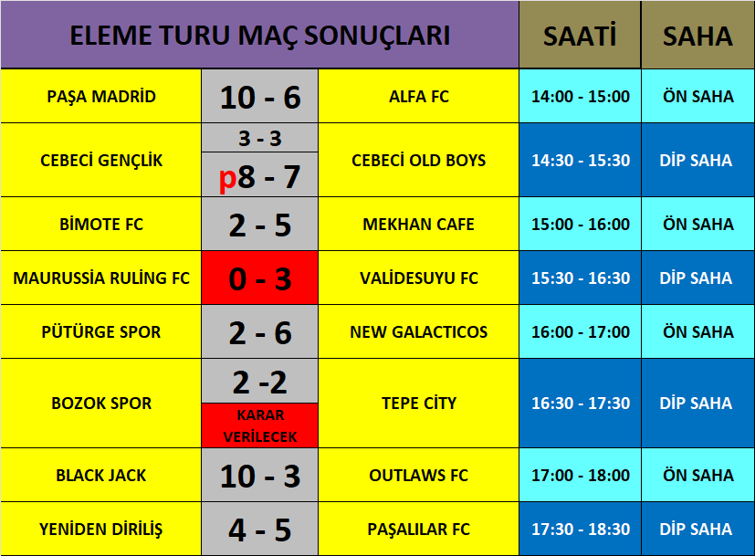 41. EBU MEDYA FUTBOL TURNUVASI ELEME TURU MAÇ SAATLERİ ![]() 41. EBU MEDYA FUTBOL TURNUVASI ELEME TURU MAÇ SAATLERİ. Kura çekiminde yarı final ve final hariç tüm maç saatleri zaten çekilmişti fakat yınede yayınlama ıhtıyacı duyuyoruz. Tüm takımlara basarılar.