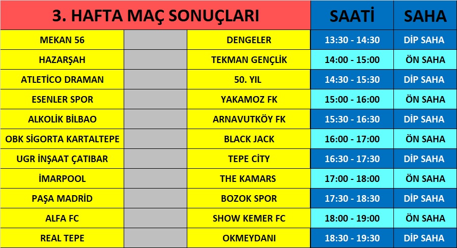 HASANOĞULLARI HAFRİYAT / EBU MEDYA FUTBOL TURNUVASI 3. HAFTA MAÇ SAATLERİ YAYINDA.. ![]() HASANOĞULLARI HAFRİYAT / EBU MEDYA FUTBOL TURNUVASI 3. HAFTA MAÇ SAATLERİ YAYINDA.. Son zamanların en zevkli ve heyecanlı haftalarından birini geride bıraktık. İnanılmaz geri dönüş ve geri dönüşe teşebbüsler. Gizli derbi diye nitelendirdiğimiz maçlar yaşadık. Yanlış oyuncu değişikliklerinın yanında, istedikleri kadrolarla maçlara çıkamayan takımlar, mağlup olarak adeta bedel ödediler. İlk hafta maçlardan istediğini alamayan takımların bu haftayı telafi olarak görmesi, ilk hafta beraberliklerinden, sonra bu hafta nasıl maçlar görecektik merakı ve favorı takımların süpriz mağlubiyetleri adeta bu haftaya damga vurdu. Bu 3.hafta ise bir çok takımın yara sarması için önemli bir hafta olabilir. Tüm takımlara başarılar... 3. HAFTA MAÇ SAATLERİ YAYINDA..